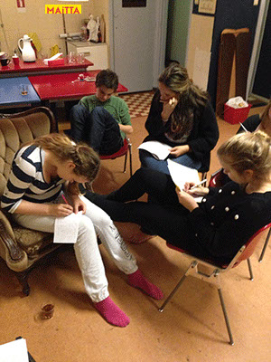 In de andere fotoserie zijn we ons eigen script aan het maken met tekeningen en knutsels van de Storm: een gezellig middagje waarin ineens over van alles en nog wat gekletst en gefilosofeerd wordt!