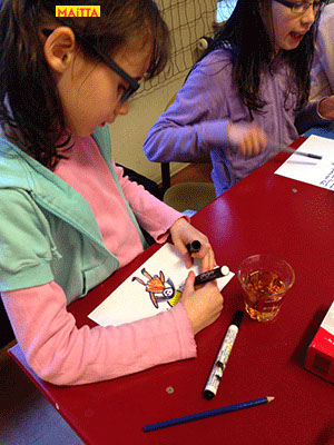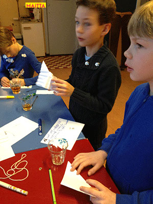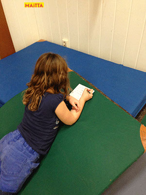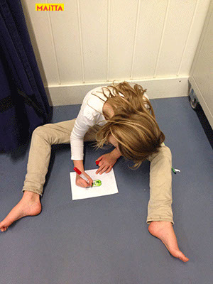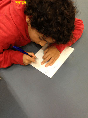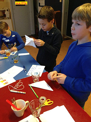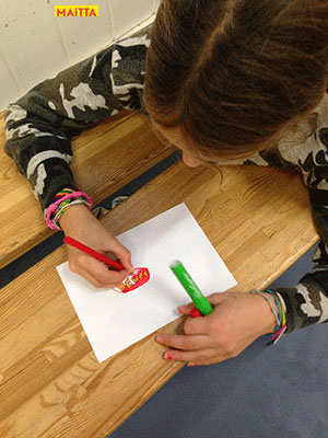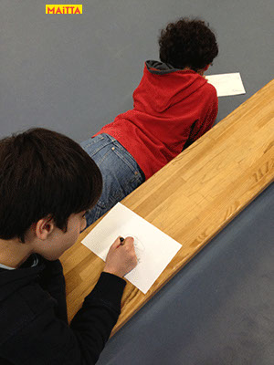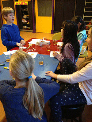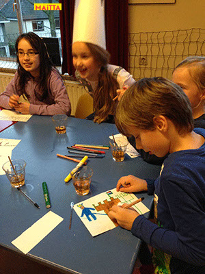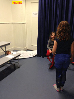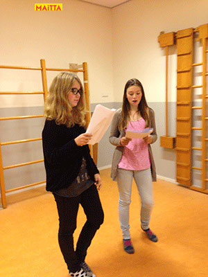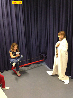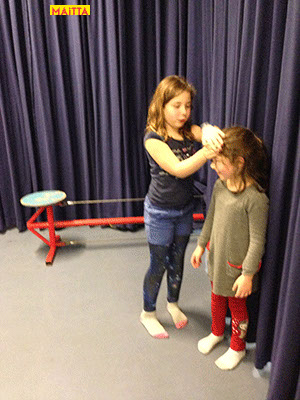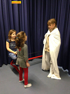 Op de foto’s de eerste verkenningen van het verhaal en de rollen. Wie vindt het leuk om welke rol te spelen en welke avonturen maakt dit personage mee. Maitta bepaalt niet wie wat speelt: we werken niet met het idee van belangrijkheid in ‘hoofdrol en bijrol’ en doen niet aan typecasting. Iedere leerling kan spelen wie hij wil: Maitta bewerkt het materiaal dusdanig dat ieder even veel aandacht krijgt en mag onderzoeken wat hij interessant vindt.