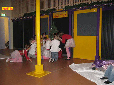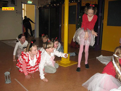 We zijn gaan spelen met allerlei dierfiguren en al gauw kwamen we uit op muizen. Annie M.G. Schmidt-muizen, fantasiemuizen én de Notenkrakermuizen. De Notenkraker blijft een inspirerend verhaal, zo rond Kerst. Het nodigde uit tot het bouwen van Amsterdamse herenhuizen, kelders, zolders en trapgangen, waar meisjes en jongens, muizen en koningen heerlijk doorheen konden dwalen. En natuurlijk kwamen we terecht in de balzaal, waar we heerlijk konden dansen. Uit deze verhaalstukjes hebben we een samenstelling gemaakt, die bij delen nog herinnert aan de oorspronkelijke vertelling.