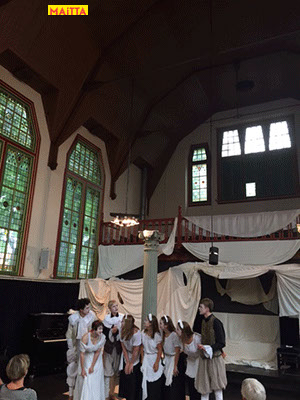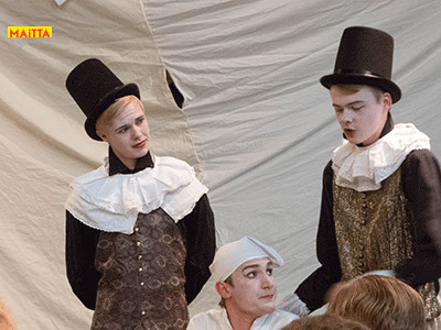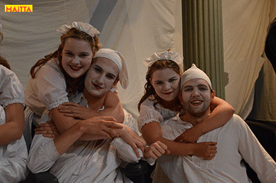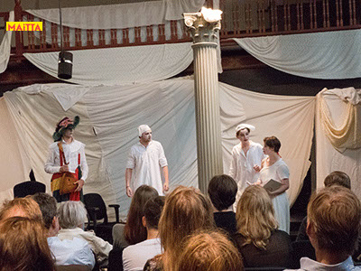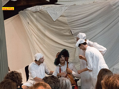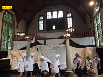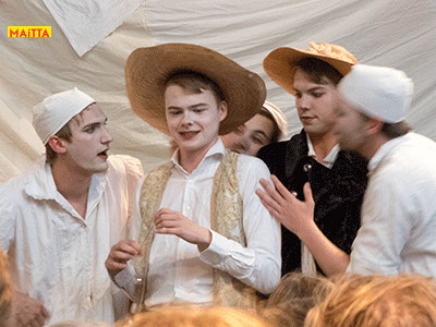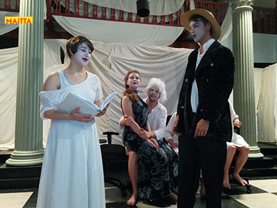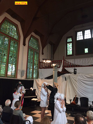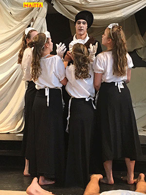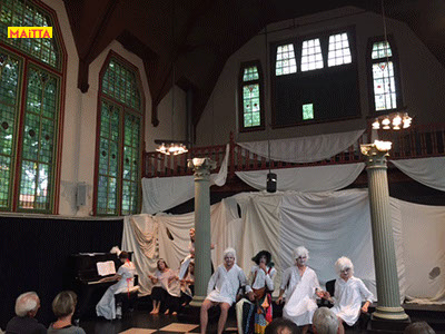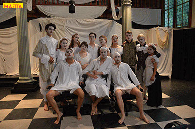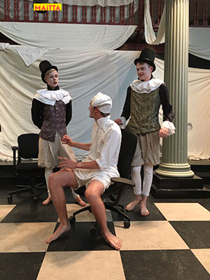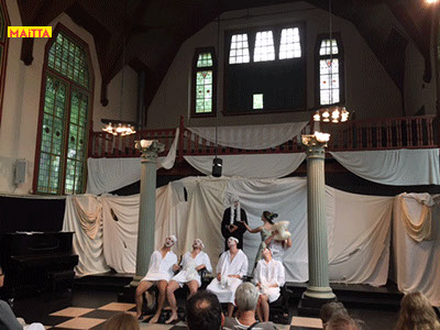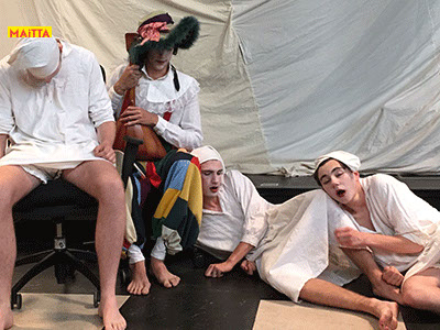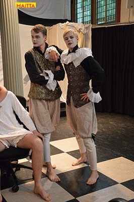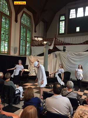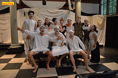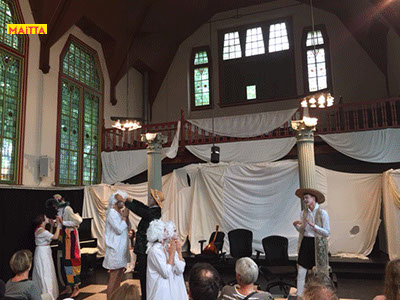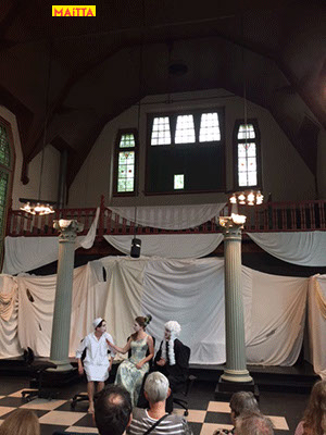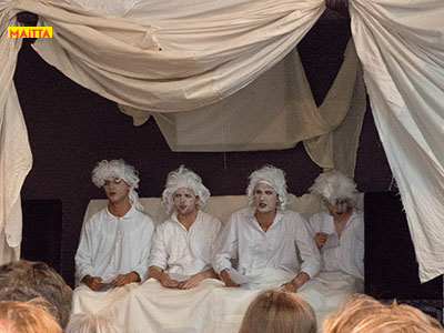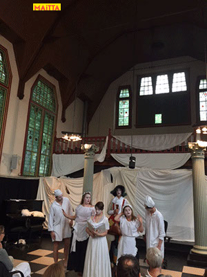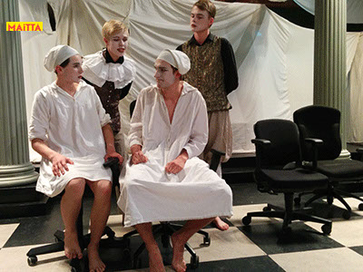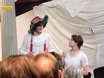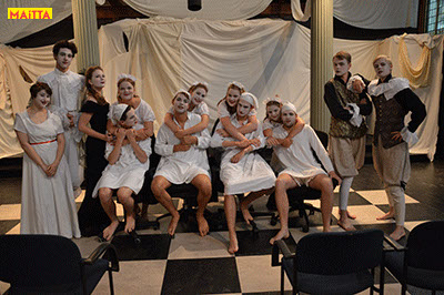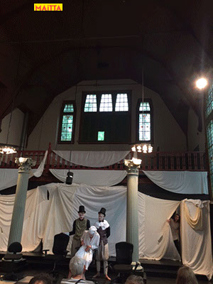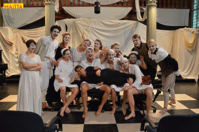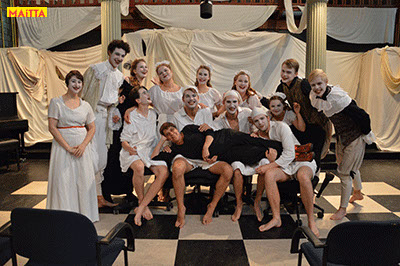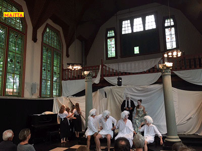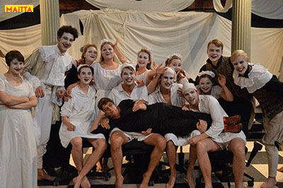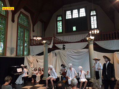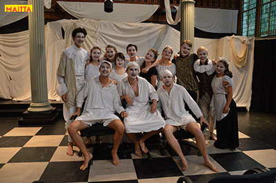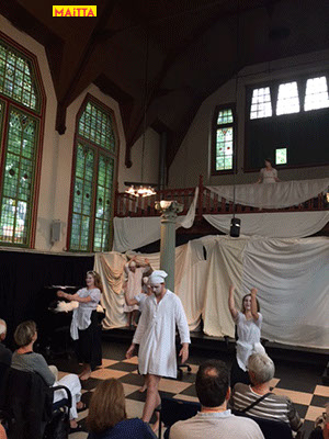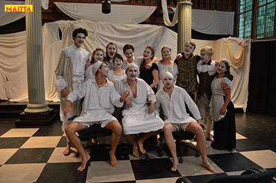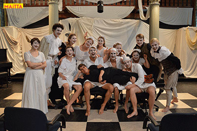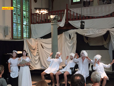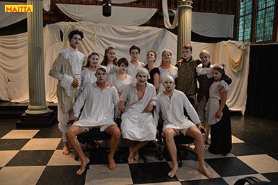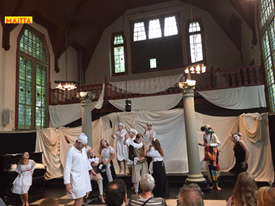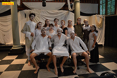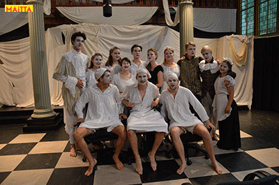 Met een doldwaas team een hilarische komedie neerzetten van Molière was een feest om te doen! Commedia dell’arte stijl vertaald naar groot spel in een decor van vergane glorie. Spelers die in 4-tallen één personage vertolkten. Solisten die door middel van diverse verkleedpartijen met kostuums die tijd en karakter accentueerden, meerdere rollen vertolkten. Scenes door de spelers zelf ontwikkeld en samen in een razende wervelwind tot een bomvolle vertoning gebracht.