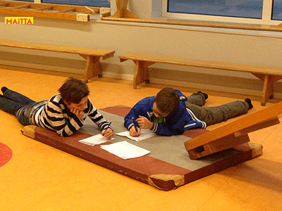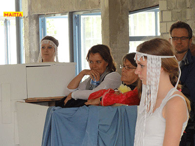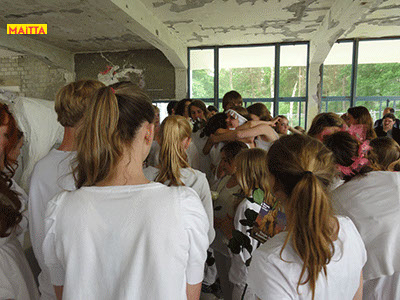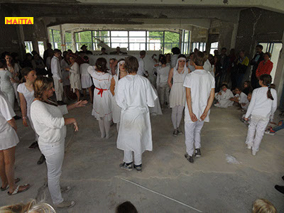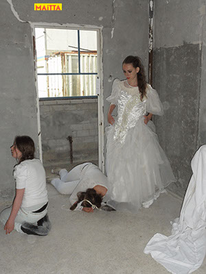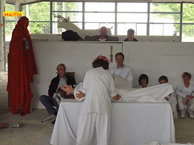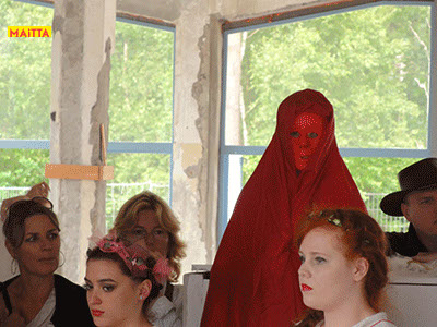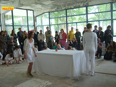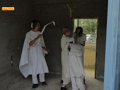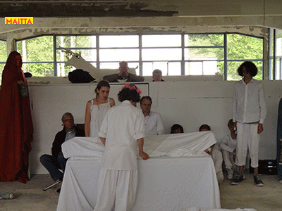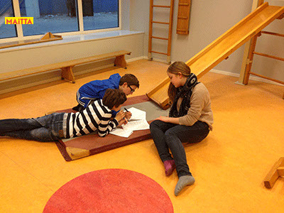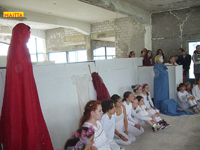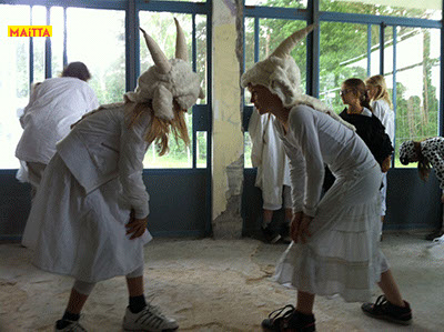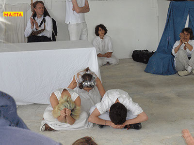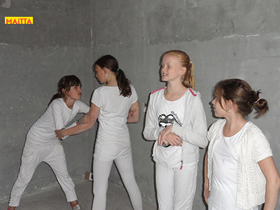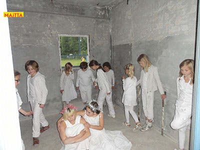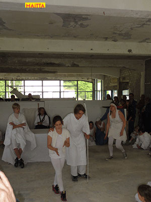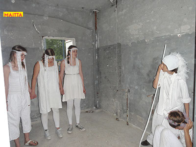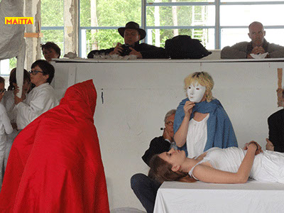Na het doorspreken van de tekst gaan ze een aantal lessen werken met verschillende spelmaterialen als startpunt om tot spel te komen. Zo werken ze met o.a. kranten, lappen, muziekfragmenten, geluid, gedichten, fotomateriaal, kledingstukken, attributen, maskers enzovoort.