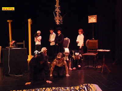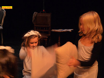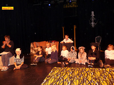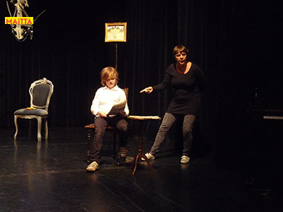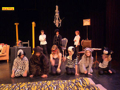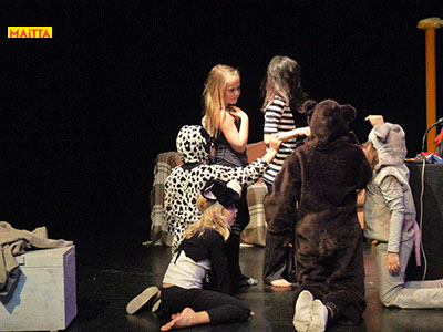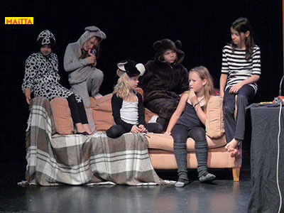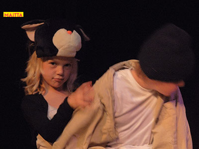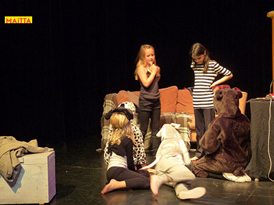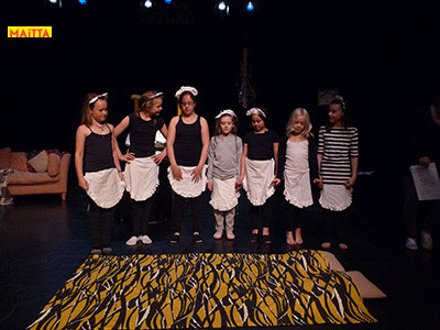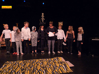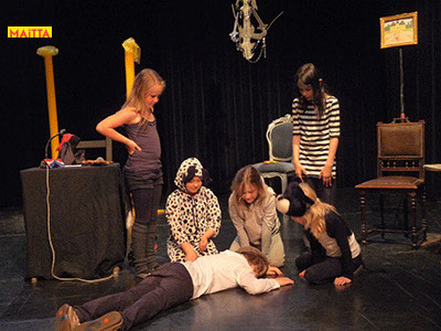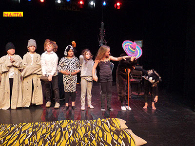 Op een gegeven moment zijn er ‘lievelingsverhalen’ ontstaan. Samen hebben we gekeken of we daar stukjes uit konden halen om verder te onderzoeken en uit te breiden. Uiteindelijk zijn we met elkaar gaan ‘schrijven’. We hebben een denkbeeldige kapstok gekozen waar we onze lievelingsrollen en -verhalen aan hebben opgehangen, en uiteindelijk zijn we dit gaan voorbereiden voor een publiekspresentatie. Daarbij was het oefenen met speltechnieken zoals o.a. rolopbouw (hoe ziet jouw personage eruit en hoe kan je elementen van jouw personage vergroten? Wat doet kostuum? Maakt het je deftig, oud, gemeen?), ritme (hoe verandert een scène als we er ineens een stilstand in doen? Of een stukje heel snel of juist langzaam spelen?) en herhalen (we doen als groep bepaalde handelingen die we telkens terug laten komen) heel belangrijk.